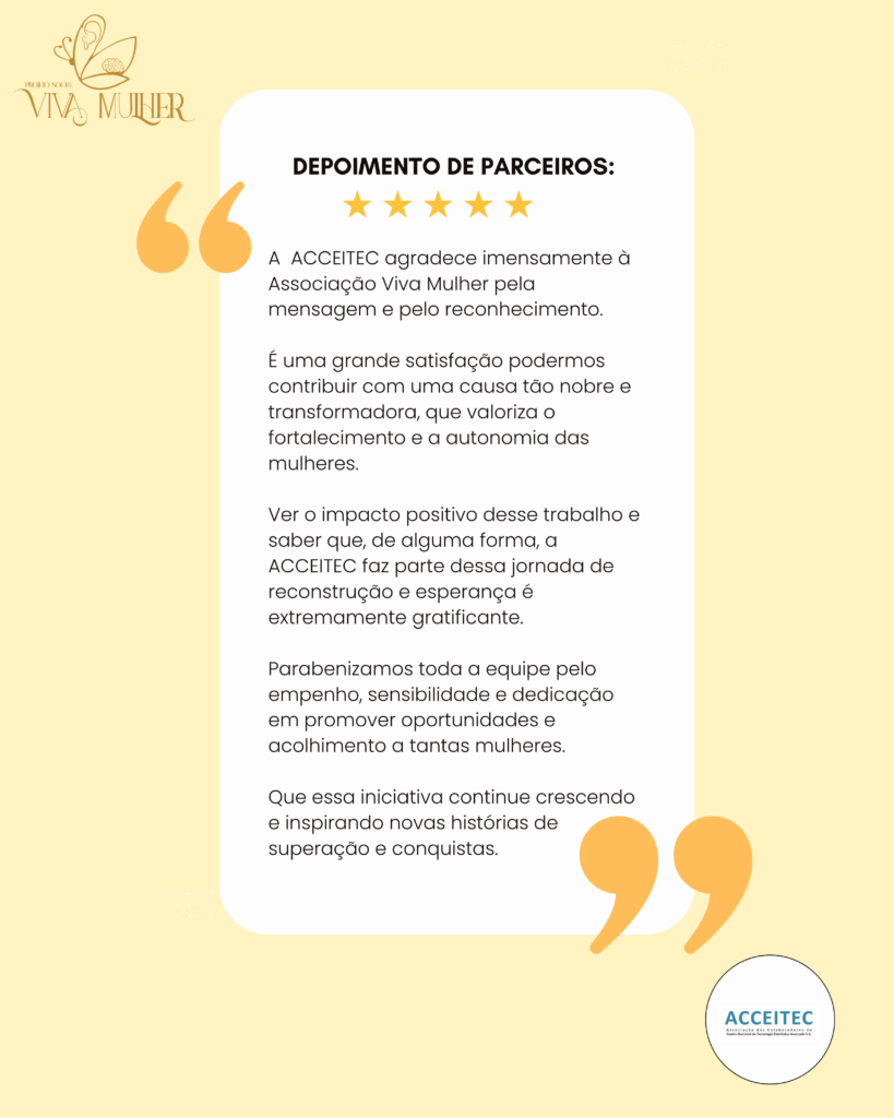 Hoje queremos expressar nossa gratidão a nossa parceira ASSOCIAÇÃO DOS COLABORADORES DA CEITEC (ACCEITEC), pelo carinho e reconhecimento! 💐Compartilhamos abaixo a bela mensagem que recebemos: “A ACCEITEC agradece imensamente à Associação Viva Mulher pela mensagem e pelo reconhecimento. É uma grande satisfação podermos contribuir com uma causa tão nobre e transformadora, que valoriza o fortalecimento e a […]